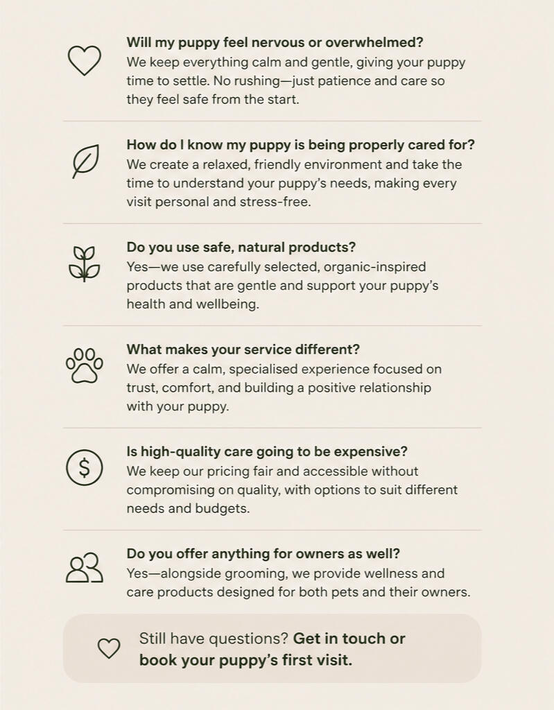 We’re a team of young entrepreneurs with a genuine love for animals and a passion for doing things differently.At Talu Amani, we believe grooming should feel calm, personal, and welcoming—not rushed or overwhelming.We take the time to get to know you and your puppy, building real trust and creating a positive experience from the very beginning.Alongside our grooming services, we offer carefully chosen wellness and care products—designed for both pets and their owners.It’s more than a service. It’s an all-in-one experience built around care, connection, and comfort.